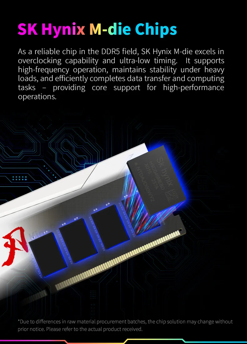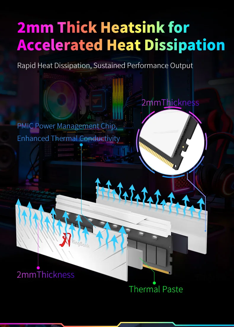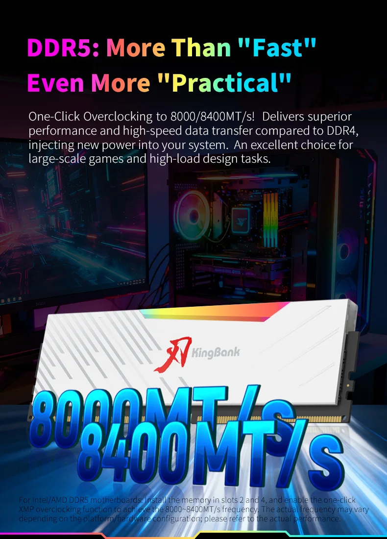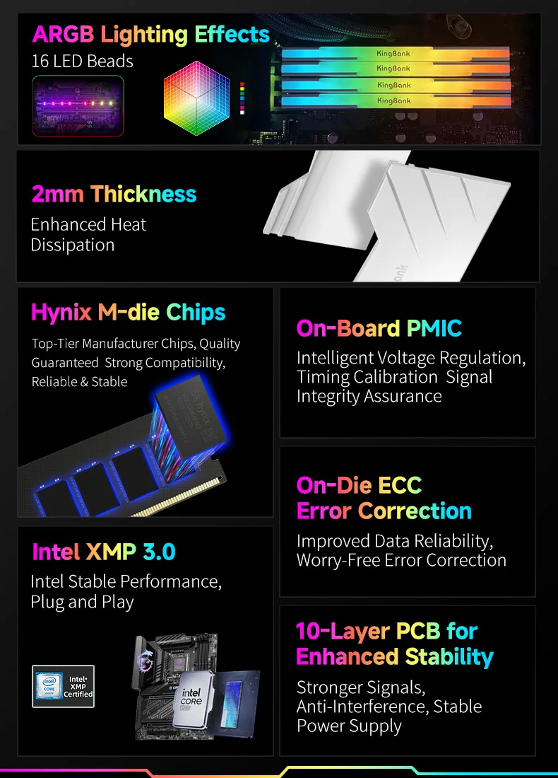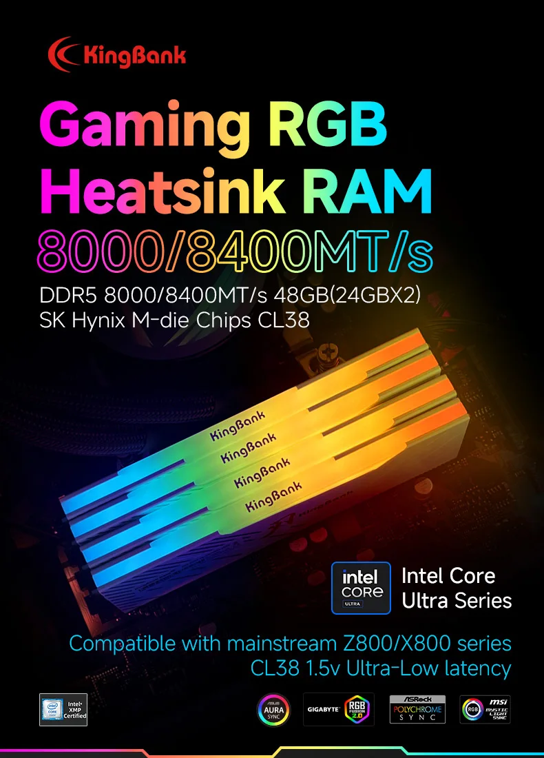A série KingBank SoarBlade KRRW DDR5 RGB pode funcionar até 8.000 ~ 8400MT/s.Os módulos de memória suportam iluminação ARGB sincronizada com placas-mãe como ASUS, MSI e GIGABYTE.Cada DIMM de 288 pinos do módulo de memória DDR5 é equipado com PMIC (Power Management IC) e ECC (Error Correcting Code), apresentando um desempenho mais estável e operação em alta velocidade.Com IC produzido originalmente e outras peças, os módulos passaram por testes rigorosos de compatibilidade, confiabilidade e desempenho geral.